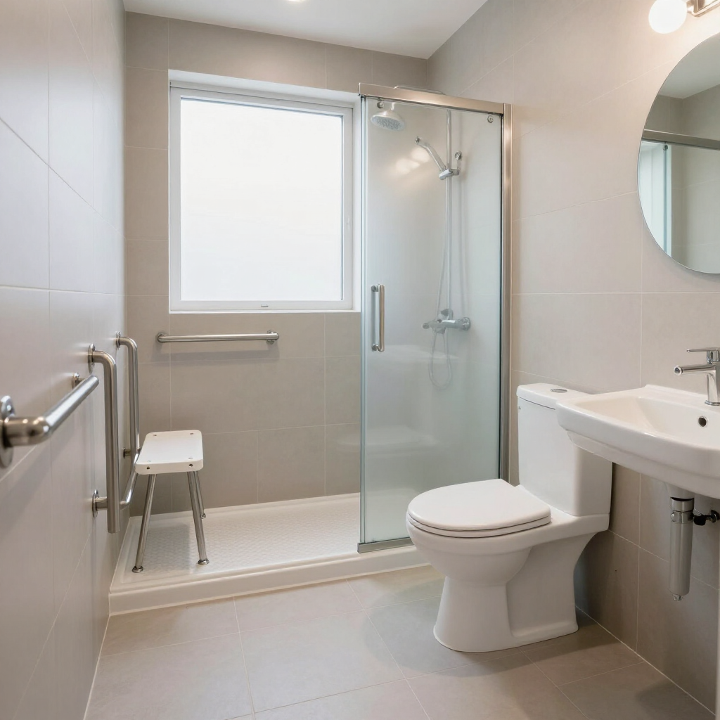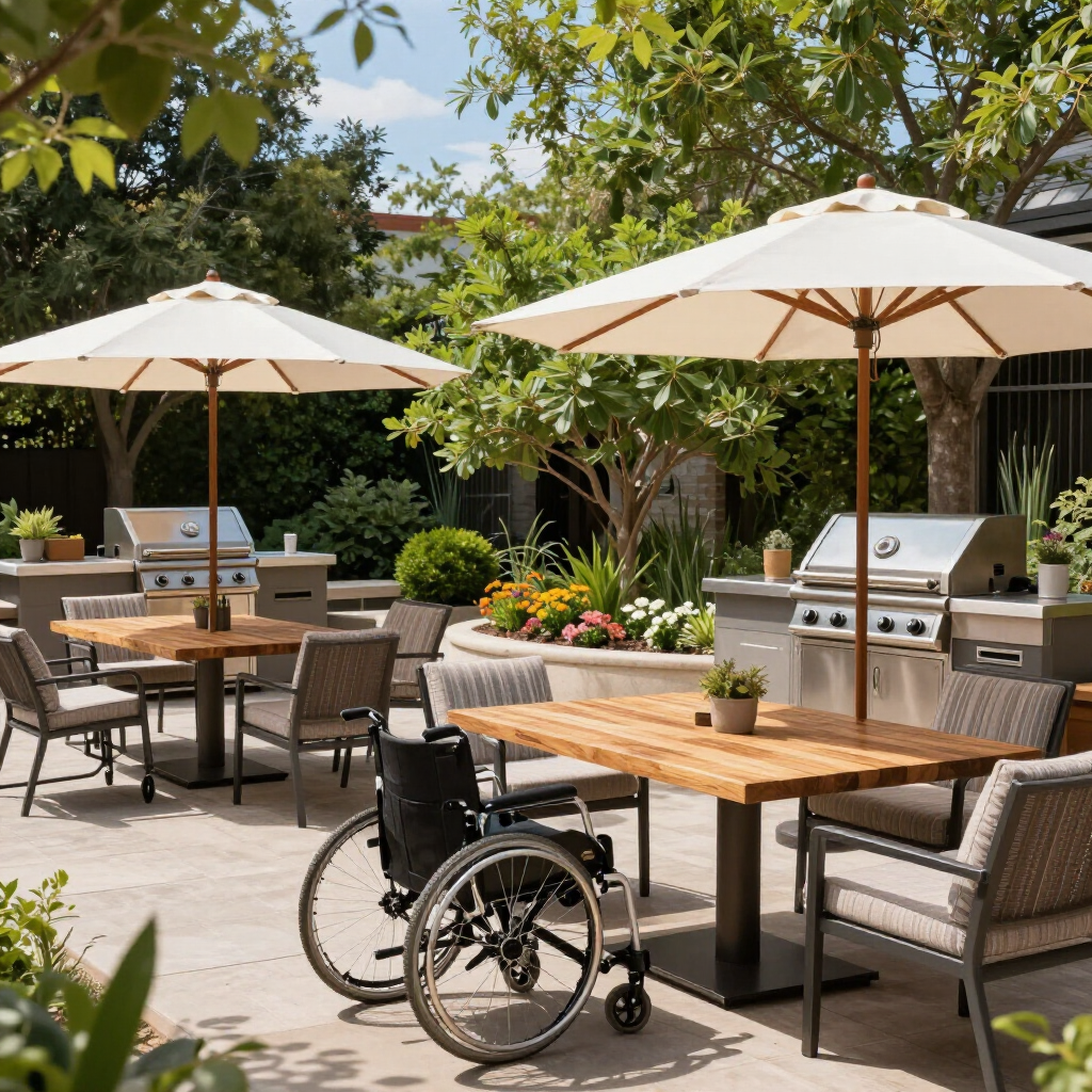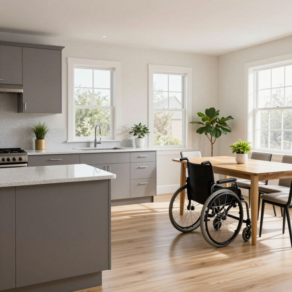 A fully accessible 5-bedroom home featuring adapted bathrooms, communal spaces, outdoor BBQ area, and on-site parking to promote comfort and independence.
